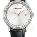Basic Information: ID: 15171BC.ZZ.A002CR.01; Brand: Audemars Piguet; Series: JULES AUDEMARS; Movement Type: Automatic Mechanical; Gender: Men’s; Movement Model: Cal.3120; Movement Type: Automatic Mechanical; Manufacturer: Audemars Piguet; Movement Diameter: 26.6 mm; Movement Thickness: 4.26 mm; Balance Wheel: Beryllium and Inert Variable Elements; Frequency: 21,600 rpm; Hairspring: Flat Hairspring; Shock Absorber: KIF Elastor Jewel count: 40; Power reserve: 41 hours; Case diameter: 39mm; Case thickness: 9mm; Dial color: Silver-white; Dial shape: Round; Strap color: Black; Buckle type: Pin buckle; Case back: Transparent; Weight: Not available; Water resistance: 20 meters; Hour markers: Bat-shaped; Buckle spacing: Not available; Lug spacing: Not available; Materials: Case material: 18k white gold; Dial material: Not available; Bezel material: 18k white gold with diamonds; Crystal material: Sapphire crystal; Crown material: 18k white gold; Strap material: Alligator leather; Buckle material: 18k white gold; Functions: Date display
