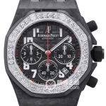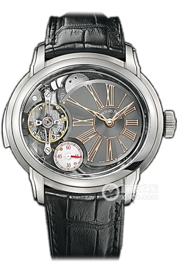 Basic Information: ID 26371TI.OO.D002CR.01; Brand: Audemars Piguet; Series: Millennium; Movement Type: Manual Mechanical; Gender: Men’s; Limited Edition: 8; Movement Model: Cal.2910 Movement Type: Manual Mechanical; Manufacturer: Audemars Piguet; Movement Diameter: 37.9 x 32.9 mm; Movement Thickness: 10.05 mm; Frequency: 21,600 vibrations per hour; Hairspring: Double-plane hairspring; Jewels: 40; Parts: 443; Power Reserve: 165 hours; Case Diameter: 47 mm; Case Thickness: 15.8 mm; Dial Color: Dark Grey; Dial Shape: Oval; Strap Color: Black; Clasp Type: Folding Clasp; Case Back: Anti-reflective sapphire crystal; Weight: Not available; Water Resistance: 20 meters; Hour Markers: Roman numerals; Clasp Spacing: Not available; Lug Spacing: Not available; Materials: Case Material: Titanium; Dial Material: Dark grey dial with rose gold applied Roman numerals and hands and silver small seconds chronograph; Bezel Material: Not available; Crystal Material: Anti-reflective sapphire crystal; Crown Material: Titanium; Strap Material: Alligator leather, hand-stitched square scales; Clasp Material: Titanium; Functions: Tourbillon, Minute Repeater