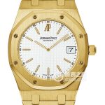 Basic Information: ID: 15202BA.OO.0944BA.01; Brand: Audemars Piguet; Series: Royal Oak; Movement Type: Automatic; Gender: Men’s; Movement Model: Cal.2121; Movement Type: Automatic; Manufacturer: Audemars Piguet; Movement Diameter: 28mm; Movement Thickness: 3.05mm; Balance Wheel: Beryllium copper and inert variable elements; Frequency: 19,800 vibrations per hour; Hairspring: Flat; Shock-resistant: KIF Elastor; Jewels: 36; Parts: 254; Power Reserve: 40 hours; Appearance: Case Diameter: 39mm; Case Thickness: 8mm; Dial Color: White; Dial Shape: Round; Strap Color: Gold; Clasp Type: Folding Clasp; Case Back: Transparent; Weight: Not available; Water Resistance: 50 meters; Hour Marker Type: Bat; Clasp Spacing: Not available; Lug Spacing: Not available; Material: Case Material: 18k Gold; Dial Material: Grande Tapisserie decoration, gold luminescent applied hour markers, gold luminescent Royal Oak. Royal Oak hands and bezel are made of 18k gold; the crystal is sapphire crystal; the crown is made of 18k gold; the bracelet is made of 18k gold; the buckle is made of 18k gold; and the functions include a date display.