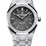 Basic Information: ID: 15454BC.GG.1259BC.03; Brand: Audemars Piguet; Series: Royal Oak; Movement Type: Automatic; Gender: Men’s; Movement Model: Cal.3120; Manufacturer: Audemars Piguet; Movement Diameter: 26.6 mm; Movement Thickness: 4.26 mm; Balance Wheel: Beryllium copper and inert variable elements; Frequency: 21,600 vibrations per hour; Hairspring: Flat; Shock-resistant: KIF Elastor; Jewels: 40; Power Reserve: 41 hours; Case Diameter: 37 mm; Case Thickness: 9.8 mm; Dial Color: Black; Dial Shape: Round; Strap Color: Silver; Clasp Type: Folding Clasp; Case Back: Anti-reflective Sapphire Crystal; Weight: Not available; Water Resistance: 50 meters; Hour Marker Type: Bat; Clasp Spacing: Not available; Lug Spacing: Not available; Material: Case Material: 18k white gold with hammered gold finish; Dial Material: Black; Dial engraved with “Grande” Features a large “Tapisserie” pattern, paired with white gold luminescent applied hour markers and Royal Oak hands. The bezel is made of 18k white gold, and the crystal is an anti-reflective sapphire crystal. The crown is made of 18k white gold, and the bracelet is made of 18k white gold with a hammered gold finish. The buckle is also made of 18k white gold. Functions include a date display.