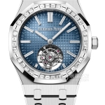 Basic Information: ID: 67656BC.GR.1261BC.01; Brand: Audemars Piguet; Series: Royal Oak; Movement Type: Quartz; Gender: Ladies; Movement Model: Cal.2713; Movement Type: Quartz; Manufacturer: Audemars Piguet; Frequency: 32,768 rpm; Number of Jewels: 7; Case Diameter: 33 mm; Case Thickness: 7 mm; Dial Color: Purple; Dial Shape: Round; Strap Color: Silver; Clasp Type: Folding Clasp; Case Back: Not Available; Weight: Not Available; Water Resistance: 50 meters; Hour Marker Type: Not Available; Clasp Spacing: Not Available; Lug Spacing: Not Available; Material: Case Material: 18k White Gold; Dial Material: Purple dial engraved with “Grande Tapisserie” large checkered pattern, paired with white gold applied Arabic numerals and luminescent Royal Oak hands. The bezel is made of 18k white gold and set with 24 baguette-cut garnets; the total weight is approximately 1.36 carats. The crystal is made of anti-reflective sapphire crystal. The crown is made of 18k white gold. The bracelet is made of 18k white gold. The buckle is currently unavailable. No functions are currently available, including date display.