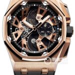 Basic Information: ID 26421OR.OO.A002CA.01; Brand: Audemars Piguet; Series: Royal Oak Offshore; Gender: Men; Limited Edition: 50; Movement: Movement Model 2947 Manufacturer: Audemars Piguet; Movement: 39.78 mm diameter, 21,600 vibrations per hour, 30 jewels, 353 parts, 173-hour power reserve; Case diameter: 45 mm; Case thickness: 16.1 mm; Dial color: Skeletonized; Dial shape: Round; Strap color: Black; Buckle type: Pin buckle; Case back: Transparent, anti-reflective sapphire crystal; Weight: Not available; Water resistance: 100 meters; Hour markers: None; Hour marker spacing: Not available; Lug spacing: Not available; Materials: Case material: 18k rose gold; Dial material: Rose gold with rose gold luminescent hands; Bezel material: 18k rose gold; Crystal material: Anti-reflective sapphire crystal; Crown material: Black ceramic, screw-down crown and pushers, sandblasted rose gold pusher guards; Strap material: Rubber; Buckle material: 18k rose gold; Functions: Chronograph, Tourbillon