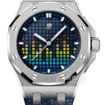 Basic Information: ID: 77600TI.OO.A343CA.01; Brand: Audemars Piguet; Series: Royal Oak Offshore; Gender: Women’s; Limited Edition: 500; Movement: Calibre 5909; Manufacturer: Audemars Piguet; Movement Diameter: 26.2 mm; Movement Thickness: 4 mm; Frequency: 28,800 vibrations per hour; Jewels: 29; Parts: 174; Power Reserve: 60 hours; Case Diameter: 37 mm; Case Thickness: 12.1 mm; Dial Color: Blue; Dial Shape: Round; Strap Color: Blue; Clasp Type: Pin Buckle; Case Back: Anti-reflective Sapphire Crystal; Weight: Not available; Water Resistance: 50 meters; Hour Marker Type: Bat; Luminous Hour Markers; Clasp Spacing: Not available; Lug Spacing: Not available; Materials: Case Material: Titanium; Dial Material: Blue dial with equalizer transfer pattern, white gold luminous applied hour markers and Royal Oak… The Oak Royal Oak features a titanium bezel, an anti-reflective sapphire crystal, a titanium screw-down crown, a mosaic-effect rubber strap with a self-changing strap system, and a titanium clasp. This model has no other special functions.