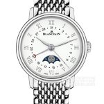 Basic Information Number: 6106-1127-MMB Brand: Blancpain Classic Gender: Ladies Movement: Movement Model: 913QL Manufacturer: Unknown Movement Diameter: 23.70 mm Movement Thickness: 4.5 mm Frequency: 21,600 vibrations per hour Hairspring: Silicon Hairspring Jewels: 20 Number of Parts: 246 Power Reserve: 40 hours Exterior Case Diameter: 29.20 mm Case Thickness: 10.35 mm Dial Color: White Dial Shape: Round Strap Color: Silver Clasp Type: Folding Clasp Case Back: Transparent Weight: Not Available Water Resistance: 30 meters Hour Markers: Roman Numerals Clasp Spacing: Not Available Lug Spacing: 15 mm Materials Case Material: Stainless Steel Dial Material: Not Available Bezel Material: Stainless Steel Crystal Material: Sapphire Crystal Glass Crown Material: Stainless Steel Strap Material: Stainless Steel Clasp Material: Stainless Steel Functions Date Display Moon Phase