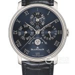 Basic Information: Perpetual Calendar Moon Phase; Brand: Blancpain; Series: Classic; Movement Type: Manual Mechanical; Gender: Men’s; Limited Edition: 88; Movement: Cal. 5954; Movement Type: Manual Mechanical; Appearance: Case Diameter: 40mm; Case Thickness: Not Available; Dial Color: Dark Blue; Dial Shape: Round; Strap Color: Dark Blue; Clasp Type: Butterfly Clasp; Case Back: Not Available; Weight: Not Available; Water Resistance: 30 meters; Hour Marker Type: Not Available; Clasp Spacing: Not Available; Lug Spacing: Not Available; Materials: Case Material: Platinum, Double Bezel; Dial Material: White Gold; Roman Numerals; Hand-set Bezel Material: Not Available; Crystal Material: Anti-reflective Sapphire Crystal; Crown Material: Not Available; Strap Material: Alligator Leather; Clasp Material: Not Available; Functions: Date Display, Day Display, Month Display, Annual Calendar, Perpetual Calendar, Moon Phase