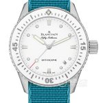 Basic Information Number 5100-1127-NATA Brand Blancpain Series Fifty Fathoms Movement Type Automatic Mechanical Gender Ladies Movement Model Cal.1150 Movement Type Automatic Mechanical Manufacturer Blancpain Movement Diameter 26.2 mm Movement Thickness 3.25 mm Number of Jewels 28 Number of Parts 210 Power Reserve 100 hours Case Diameter: 38.00 mm Case Thickness: 10.70 mm Dial Color: White Dial Shape: Round Strap Color: Blue Buckle Type: Pin Buckle Case Back: Transparent Weight: Not available Water Resistance: 300 meters Hour Marker Type: Round Hour Markers Luminous Clasp Spacing: Not available Lug Spacing: 20 mm Materials Case Material: Satin-brushed stainless steel Dial Material: Not available Bezel Material: Unidirectional rotating satin-brushed stainless steel bezel with ceramic inlay and liquid metal hour markers Crystal Material: Sapphire Crystal Glass Crown Material: Satin-brushed stainless steel Strap Material: NATO Buckle Material: Satin-brushed stainless steel Functions: Date Display