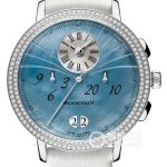 Basic Information Number: 3626-4544L-64A Brand: Blancpain Series: Ladies’ Movement Type: Automatic Mechanical Gender: Ladies’ Movement Model: 26F8G Movement Type: Automatic Mechanical Manufacturer: Blancpain Movement Diameter: 25.60 mm Movement Thickness: 7 mm Balance Wheel: Glucydur, Free-sprung Balance Spring Jewels: 44 Number of Parts: 495 Power Reserve: 40 hours Exterior Case Diameter: 38.60 mm Case Thickness: 13.10 mm Dial Color: Blue Dial Shape: Round Strap Color: White Clasp Type: Pin Buckle Case Back: Transparent Weight: Not Available Water Resistance: 30 meters Hour Markers: Roman Numerals Clasp Spacing: Not Available Lug Spacing: 18 mm Materials Case Material: Stainless Steel Dial Material: Pearl Dial Material: Stainless Steel Diamond-set Bezel Material: Sapphire Crystal Glass: Sapphire Crystal Crown Material: Stainless Steel Strap Material: Satin Textured Rubber Clasp Material: Stainless Steel Functions: Large Date, Chronograph, Flyback/Retrograde