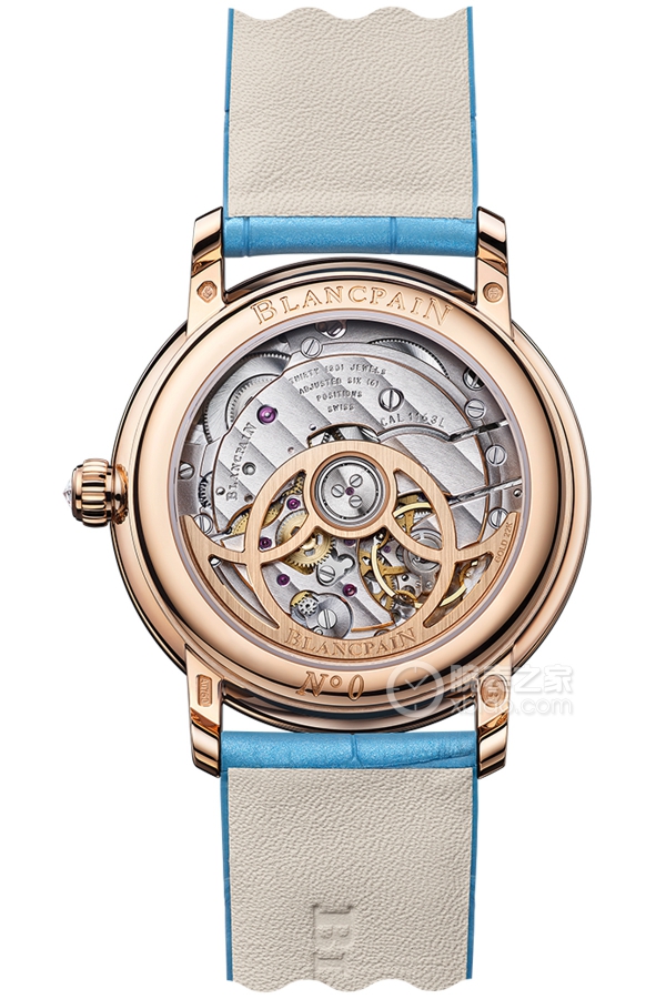 Basic Information Number: 3662D-2954-55B Brand: Blancpain Series: Ladies’ Movement Type: Automatic Mechanical Gender: Ladies’ Movement Model: 1163L Movement Type: Automatic Mechanical Manufacturer: Blancpain Movement Diameter: 26.2 mm Movement Thickness: 4.58 mm Frequency: 21,600 vibrations per hour Number of Jewels: 30 Number of Parts: 243 Power Reserve: 100 hours Exterior Case Diameter: 34.9 mm Case Thickness: 10.43 mm Dial Color: White Dial Shape: Round Strap Color: Blue Clasp Type: Folding Clasp Case Back: Transparent Weight: Not available Water Resistance: 30 meters Hour Markers: Roman numerals Clasp Spacing: Not available Lug Spacing: 18 mm Materials Case Material: 18k red gold, diamond-set lugs Dial Material: Mother-of-pearl Bezel Material: 18k red gold with diamonds Crystal Material: Sapphire crystal Crown Material: 18k red gold Strap Material: Alligator leather Clasp Material: Not available Functions: Moon phase