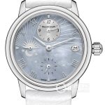 Basic Information Number: 3760-1144L-95A Brand: Blancpain Series: Ladies’ Movement Type: Automatic Mechanical Gender: Ladies’ Movement Model: Cal.5L60 Movement Type: Automatic Mechanical Manufacturer: Blancpain Movement Diameter: 26.2 mm Movement Thickness: 4.35 mm Number of Jewels: 30 Number of Parts: 253 Power Reserve: 100 hours Case Diameter: 34 mm Case Thickness: 10.4 mm Dial Color: Light Blue Dial Shape: Round Strap Color: White Clasp Type: Pin Buckle Case Back: Transparent Weight: Not Available Water Resistance: 100 meters Hour Markers: Roman Numerals Clasp Spacing: Not Available Lug Spacing: 18 mm Materials Case Material: Stainless Steel Dial Material: Pearl Layer Bezel Material: Not Available Crystal Material: Sapphire Crystal Crown Material: Pearl Layer Strap Material: 5 Interchangeable Straps Available Clasp Material: Stainless Steel Functions: Date Display, Dual Time Zone, GMT