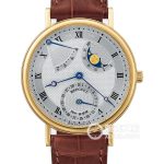 Basic Information ID: 3137BA/11/986 Brand: Breguet Classic Gender: Men’s Movement: Cal.502 DR Manufacturer: Unknown Appearance: Case Diameter: 36mm Case Thickness: 7.35mm Dial Color: Silver-grey Dial Shape: Round Strap Color: Dark Brown Clasp Type: Pin Buckle Case Back: Transparent Weight: Not available Water Resistance: 30 meters Hour Markers: Roman numerals Clasp Spacing: Not available Lug Spacing: Not available Materials: Case Material: 18k gold Dial Material: Not available Bezel Material: 18k gold Crystal Material: Sapphire Crystal Crown Material: 18k gold Strap Material: Alligator Leather Clasp Material: 18k gold Functions: Date Display, Moon Phase, Power Reserve