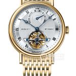 Basic Information Number: 5317BA/12/AV0 Brand: Breguet Series: Classic Complex Movement Type: Automatic Mechanical Gender: Men’s Movement: Cal.587DR Movement Type: Automatic Mechanical Manufacturer: Breguet Movement Diameter: 27.6 mm Frequency: 21,600 vibrations per hour Hairspring: Breguet Jewels: 32 Power Reserve: 120 hours Exterior: Case Diameter: 39 mm Case Thickness: 11.15 mm Dial Color: Silver-grey Dial Shape: Round Strap Color: Gold Buckle Type: Pin Buckle Case Back: Transparent Weight: Not available Water Resistance: 30 meters Hour Markers: None Hour Marker Spacing: Not available Lug Spacing: Not available Materials: Case Material: 18k gold Dial Material: Silver-plated gold Bezel Material: Not available Crystal Material: Sapphire crystal Crown Material: 18k gold Strap Material: 18k gold Buckle Material: 18k gold Functions: Power Reserve Display, Tourbillon