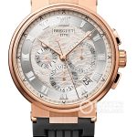 Basic Information: Model Number 5527BR/12/5WV; Brand: Breguet; Series: Marine; Movement Type: Automatic; Gender: Men’s; Movement Model: 582QA; Movement Type: Automatic; Manufacturer: Breguet; Balance Wheel: Breguet; Frequency: 28,800 vibrations per hour; Number of Jewels: 28; Number of Parts: 346; Power Reserve: 48 hours; Exterior: Case Diameter: 42.3 mm; Case Thickness: 13.85 mm; Dial Color: Silver-grey; Dial Shape: Round; Strap Color: Black; Clasp Type: Folding Clasp; Case Back: Transparent; Weight: Not available; Water Resistance: 100 meters; Hour Markers: Roman numerals; Clasp Spacing: Not available; Lug Spacing: Not available; Material: Case Material: 18k rose gold with coin-edge guilloché finish; Dial Material: Silver-plated gold dial with guilloché engraving, engraved with individual serial numbers and Breguet’s signature. Roman numeral hour markers with luminous display. Minute counter at 3 o’clock, hour counter at 6 o’clock. A small seconds hand is positioned at 9 o’clock, and the date window is located between 4 and 5 o’clock. Faceted gold Breguet hands with luminous display. A central chronograph hand completes the design, continuing the nautical theme. The bezel is 18k rose gold, the crystal is sapphire crystal, the crown is 18k rose gold, the strap is rubber, and the buckle is 18k rose gold. Functions include date display and chronograph.