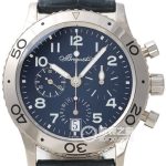 Basic Information: Model Number 3820BB/E2/9W6; Brand: Breguet; Series: TYPE XX; Movement Type: Automatic Mechanical; Gender: Men’s; Movement Model: Cal.582Q; Manufacturer: Breguet; Diameter: 31mm; Jewels: 25; Case Diameter: 39.5mm; Case Thickness: 14.4mm; Dial Color: Dark Blue; Dial Shape: Round; Strap Color: Blue; Clasp Type: Folding Clasp; Case Back: Solid; Weight: Not Available; Water Resistance: 100 meters; Hour Markers: Arabic Numerals; Clasp Spacing: Not Available; Lug Spacing: Not Available; Materials: Case Material: 18k White Gold; Dial Material: Not Available; Bezel Material: 18k White Gold; Crystal Material: Sapphire Crystal; Crown Material: 18k White Gold; Strap Material: Alligator Leather; Clasp Material: 18k White Gold; Functions: Date Display, Large Date, Chronograph, Flyback/Retrograde