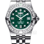 Basic Information Number: A71340LA.L516.166Z.A14D1 Brand: Breitling Movement Type: Quartz Gender: Ladies Movement Model: Cal.71 Movement Type: Quartz Manufacturer: Breitling Battery Life: 6 years Technical Certification: Swiss Official Chronometer Testing Institute (COSC) Appearance: Case Diameter: 30 mm Case Thickness: 12.2 mm Dial Color: Green Dial Shape: Round Strap Color: Green Clasp Type: Folding Clasp Case Back: Solid Weight: Not Available Water Resistance: 100 meters Hour Markers: Diamond-set Hour Markers Clasp Spacing: Not Available Lug Spacing: Not Available Materials: Case Material: Stainless Steel Dial Material: Not Available Bezel Material: Stainless Steel with Diamonds Crystal Material: Sapphire Crystal Glass Crown Material: Not Available Strap Material: Lizard Skin Clasp Material: Stainless Steel Functions: Date Display