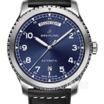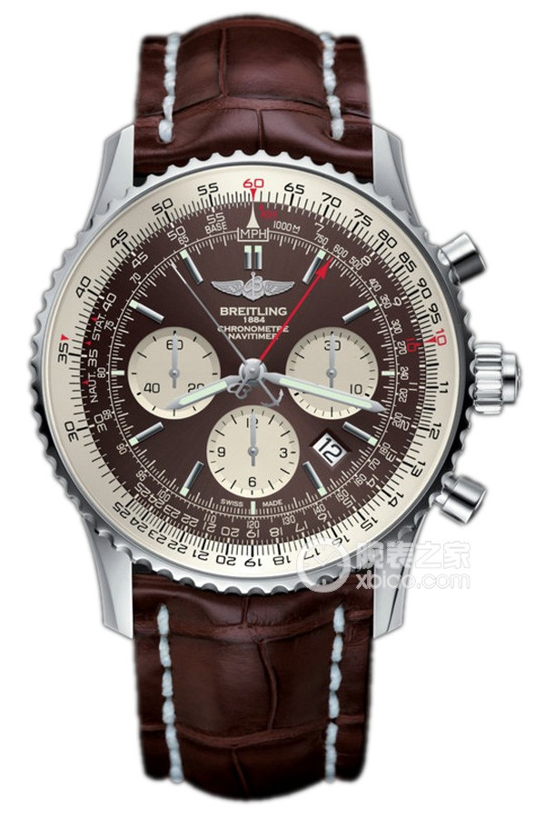 Basic Information: ID: AB031021.Q615.756P.A20BA.1; Brand: Breitling; Series: Aviation Chronograph; Gender: Men’s; Movement: Movement Model: B03; Manufacturer: Unknown; Frequency: 28,800 vibrations per hour; Jewels: 46; Power Reserve: 70 hours; Appearance: Case Diameter: 45 mm; Case Thickness: 15.73 mm; Dial Color: Copper; Dial Shape: Round; Strap Color: Dark Brown; Clasp Type: Pin Buckle; Case Back: Solid; Weight: Not available; Water Resistance: 30 meters; Hour Marker Type: Bat; Luminous Count: Not available; Lug Spacing: Not available; Lug Spacing: Not available; Materials: Case Material: Stainless Steel; Dial Material: Not available; Bezel Material: Stainless Steel; Crystal Material: Double Anti-reflective Sapphire Crystal; Crown Material: Stainless Steel; Strap Material: Alligator Leather; Clasp Material: Stainless Steel; Functions: Date Display, Chronograph, Split-seconds