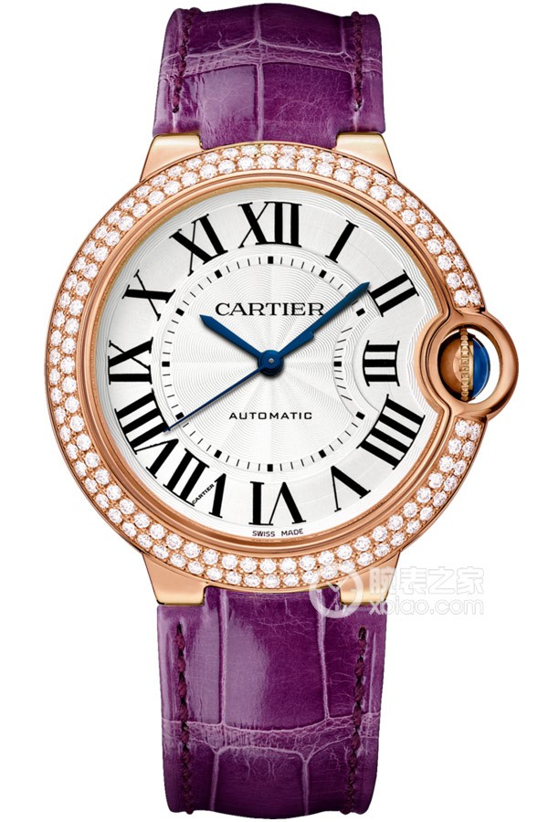 Basic Information ID: WJBB0009 Brand: Cartier Series: Ballon Bleu Movement Type: Automatic Gender: Ladies Movement Type: Automatic Appearance: Case Diameter: 36mm Case Thickness: 12.1mm Dial Color: White Dial Shape: Round Strap Color: Purple Clasp Type: Folding Clasp Case Back: Transparent Weight: Not available Water Resistance: 30 meters Hour Markers: Roman numerals Clasp Spacing: Not available Lug Spacing: Not available Materials: Case Material: 18k rose gold Dial Material: Silver-plated, blued steel sword-shaped hands Bezel Material: 18k rose gold with diamond setting Crystal Material: Sapphire crystal Crown Material: 18k rose gold with a cabochon sapphire Strap Material: Alligator leather Clasp Material: 18k rose gold Functions: This watch has no other special functions.