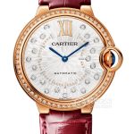 Basic Information ID: WJBB0081 Brand: Cartier Series: Ballon Bleu Movement Type: Automatic Gender: Ladies Movement Type: Automatic Appearance: Case Diameter: 36mm Case Thickness: 12.06mm Dial Color: Silver-white Dial Shape: Round Strap Color: Burgundy Clasp Type: Pin Buckle Case Back: Solid Weight: Not available Water Resistance: 30 meters Hour Marker Type: Diamond-set Hour Marker Spacing: Not available Lug Spacing: Not available Materials: Case Material: 18k rose gold Dial Material: Set with 21 brilliant-cut round diamonds, total weight 0.19 carats Bezel Material: 18k rose gold, set with 54 brilliant-cut round diamonds, total weight 0.78 grams Crystal Material: Sapphire crystal Crown Material: 18k rose gold, crown set with a cabochon sapphire Strap Material: Alligator leather Clasp Material: 18k rose gold Functions: This watch has no other special functions.