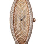 Basic Information ID: WJBA0011 (Extra Large) Brand: Cartier Series Gender: Women’s Movement: Movement Model: 1917 MC Manufacturer: Unknown Appearance: Case Diameter: 52 x 23 mm Case Thickness: 8 mm Dial Color: Pavé Diamonds Dial Shape: Oval Strap Color: Grayish Brown Clasp Type: Pin Buckle Case Back: Not Available Weight: Not Available Water Resistance: 30 meters Hour Marker Type: None Hour Marker Spacing: Not Available Lug Spacing: Not Available Material: Case Material: 18k rose gold, set with brilliant-cut round diamonds, 617 diamonds, approx. 4.74 carats Dial Material: Set with brilliant-cut round diamonds, 617 diamonds, approx. 4.74 carats, sword-shaped blued steel hands Bezel Material: 18k rose gold with diamonds Crystal Material: Sapphire Crystal Glass Crown Material: 18k rose gold Strap Material: Alligator Leather Clasp Material: 18k rose gold Functions: This watch has no other special functions.