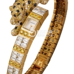 Basic Information Number HPI00665 Brand Cartier Series Creative Gemstone Watch Movement Type Quartz Gender Women’s Limited Edition 1 Movement Model Cal.058 Movement Type: Quartz; Manufacturer: Cartier; Jewels: 4; Appearance: Case Diameter: Not Available; Case Thickness: Not Available; Dial Color: Not Available; Dial Shape: Not Available; Strap Color: Not Available; Clasp Type: Not Available; Case Back: Not Available; Weight: Not Available; Water Resistance: 30 meters; Hour Marker Type: Not Available; Clasp Spacing: Not Available; Lug Spacing: Not Available; Materials: Case Material: 18k white gold with diamonds, set with 63 pear-shaped brown diamonds totaling 9.42 carats, 5 rose-cut brown diamonds totaling 0.52 carats, 1 round brown diamond, and 769 brilliant-cut round diamonds totaling 11.55 carats; Dial Material: Silvered translucent lacquered dial with sunburst effect, a brilliant-cut round diamond hour marker at 12 o’clock, sword-shaped 18k rhodium-plated white gold hands; Bezel Material: Not Available; Crystal Material: Not Available; Crown Material: Not Available; Strap Material: Not Available; Clasp Material: Not Available; Functions: This watch has no other special functions.