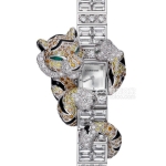 Basic Information ID HPI00923 Brand: Cartier Series Creative Gemstone Watch Movement Type: Quartz Gender: Ladies Movement Type: Quartz Appearance: Case Diameter: Not Available Case Thickness: Not Available Dial Color: Not Available Dial Shape: Not Available Strap Color: Not Available Clasp Type: Not Available Case Back: Not Available Weight: Not Available Water Resistance: 30 meters Hour Marker Type: Not Available Clasp Spacing: Not Available Lug Spacing: Not Available Material: 18K rhodium-plated white gold case and bracelet, set with 12 leaf-shaped sapphires, totaling 11.89 carats, 8 of which are leaf-shaped. Emerald, total weight 5.54 carats; a 0.06-carat round multi-faceted sapphire; 1,212 brilliant-cut round diamonds, total weight 14.60 carats; emerald panther eye, weight 0.02 carats; onyx panther nose; dial material: silver-plated brushed dial with sunburst effect; diamond hour marker at 12 o’clock; sword-shaped 18K rhodium-plated gold hands; bezel material: not available; crystal material: not available; crown material: not available; strap material: not available; buckle material: not available; functions: this watch has no other special functions.