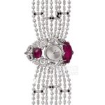 The watch features an 18K rhodium-plated white gold case set with a sculpted cabochon rubellite weighing 46.65 carats and a pear-shaped rose-cut diamond weighing 0.78 carats. The case material is…