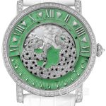 Basic Information Number HPI01560 Brand: Cartier Movement Type: Manual Mechanical Gender: Women’s Limited Edition: 30 Movement Model: 9982 MC Movement Type: Manual Mechanical Movement; Diameter: 31.98 mm; Movement Thickness: 4.85 mm; Power Reserve: 48 hours; Case Diameter: 40 mm; Case Thickness: 11.75 mm; Dial Color: Green; Dial Shape: Round; Strap Color: White; Clasp Type: None; Case Back: Transparent with Synthetic Sapphire Crystal; Weight: None; Water Resistance: 30 meters; Hour Marker Type: None; Clasp Spacing: None; Lug Spacing: None; Materials: Case Material: 18k rhodium-plated white gold, set with 288 brilliant-cut round diamonds totaling 2.82 carats; Dial Material: 18k white gold; Dial Material: Set with 319 brilliant-cut round diamonds totaling 0.57 carats; Jadeite, Black Lacquer Leopard Spots and Nose, Pear-shaped Emerald Leopard Eyes totaling 0.08 carats, Grey Stainless Steel Hands; Bezel Material: 18k rhodium-plated white gold with Diamonds; Crystal Material: Sapphire Crystal; Crown Material: 18k rhodium-plated white gold; Strap Material: Alligator Leather (Green Alligator Leather Strap Available) The buckle material currently lacks a flyback/reverse function.