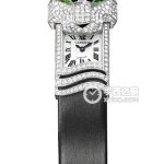Basic Information ID: WG500031 Brand: Cartier Series: Panther Movement Type: Quartz Gender: Ladies Movement Model: Cal.056 Movement Type: Quartz Manufacturer: Cartier Jewels: 5 Case Diameter: 36.65 x 21.5 mm Case Thickness: 14.5 mm Dial Color: White Dial Shape: Square Strap Color: Black Clasp Type: Folding Clasp Case Back: Solid Weight: Not available Water Resistance: 30 meters Hour Markers: Roman numerals Clasp Spacing: Not available Lug Spacing: Not available Materials: Case Material: 18k white gold with diamonds Dial Material: Painted Bezel Material: Not available Crystal Material: Sapphire Crystal Crown Material: 18k white gold with a sapphire crystal Strap Material: Silk Strap Clasp Material: 18k white gold Functions: This watch has no other special functions.
