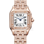 Basic Information Number: WJPN0059 Brand: Cartier Series: PANTHÈRE DE CARTIER Movement Type: Quartz Gender: Ladies Movement Type: Quartz Case Diameter: 30.3*22 mm Case Thickness: 6.05 mm Dial Color: White Dial Shape: Square Strap Color: Gold Clasp Type: Folding Clasp Case Back: Not Available Weight: Not Available Water Resistance: 30 meters Hour Marker Type: Roman Numerals Clasp Spacing: Not Available Lug Spacing: Not Available Materials: Case Material: Gold with Diamonds Dial Material: Not Available Bezel Material: Gold with Diamonds Crystal Material: Sapphire Crystal Crown Material: Gold with Diamonds Strap Material: Gold with Diamonds Clasp Material: Gold Functions: This watch has no other special functions.