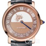 Basic Information ID: WHRO0042 Brand: Cartier Series: ROTONDE DE CARTIER Movement Type: Manual Mechanical Gender: Men’s Movement: Movement Model: 9982 MC Movement Type: Manual Mechanical Manufacturer: Cartier Movement Diameter: 32.58 mm Movement Thickness: 4.85 mm Frequency: 28,800 vibrations per hour Number of Jewels: 26 Number of Parts: 174 Power Reserve: 48 hours Appearance: Case Diameter: 40 mm Case Thickness: 10.7 mm Dial Color: Brown Dial Shape: Round Strap Color: Gray Clasp Type: Folding Clasp Case Back: Transparent Weight: Not available Water Resistance: 30 meters Hour Marker Type: Roman Numerals Clasp Spacing: Not available Lug Spacing: Not available Material: Case Material: 18k Rose Gold Dial Material: Brown dial with guilloché and sunray finish, white transfer Roman numerals. Gold day/night hour markers, sword-shaped blued steel minute hand, 18k rose gold bezel, sapphire crystal glass, 18k rose gold crown, beaded crown set with a cabochon sapphire crystal, alligator leather strap, 18k rose gold buckle, dual time zone, flyback/retrograde tourbillon, minute repeater.