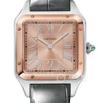 Basic Information ID: W2SA0027 Brand: Cartier Series: Santos Movement Type: Manual Mechanical Gender: Men’s Limited Edition: 300 Movement Type: Manual Mechanical Appearance: Case Diameter: 43.5 x 31.4 mm Case Thickness: 7.3 mm Dial Color: Rose Gold Dial Shape: Square Strap Color: Greenish Grey Clasp Type: Pin Buckle Case Back: Solid Weight: Not Available Water Resistance: 30 meters Hour Marker Type: Roman Numerals Clasp Spacing: Not Available Lug Spacing: Not Available Materials: Case Material: Stainless Steel Dial Material: Satin-finished rose gold dial with sunray finish, Roman numeral and Chinese character hour markers, sword-shaped polished stainless steel hands. Bezel Material: 18k Rose Gold Crystal Material: Synthetic Sapphire Crystal Crown Material: Stainless Steel Round bead crown set with a cabochon jade Strap Material: Alligator Leather Clasp Material: Stainless Steel Functions: This watch has no other special functions.