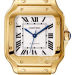 Basic Information ID: WGSA0043 Brand: Cartier Series: Santos Movement Type: Automatic Gender: Unisex Movement Model: 1847 MC Movement Type: Automatic Manufacturer: Cartier Appearance: Case Diameter: 35.1 mm Case Thickness: 8.83 mm Dial Color: White Dial Shape: Square Strap Color: Gold Clasp Type: Folding Clasp Case Back: Not Available Weight: Not Available Water Resistance: 100 meters Hour Markers: Roman Numerals Clasp Spacing: Not Available Lug Spacing: Not Available Materials: Case Material: 18k Gold Dial Material: Not Available Bezel Material: 18k Gold Crystal Material: Sapphire Crystal Crown Material: 18k Gold Heptagonal crown with a multi-faceted sapphire crystal Strap Material: 18k Gold Clasp Material: 18k Gold Functions: This watch has no other special functions.