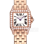 Basic Information ID: WM505017 Brand: Cartier Series: Santos Movement Type: Automatic Gender: Ladies Movement Model: Cal.076 Movement Type: Automatic Manufacturer: Cartier Base Movement: ETA 2671 Jewels: 25 Case Diameter: 44.2 x 33 mm Case Thickness: 13.3 mm Dial Color: Black Dial Shape: Square Strap Color: Black Clasp Type: Security Clasp Case Back: Solid Weight: Not available Water Resistance: 100 meters Hour Markers: Roman numerals Clasp Spacing: Not available Lug Spacing: Not available Materials: Case Material: 18k rose gold with diamonds, round diamonds Dial Material: Not available Bezel Material: Not available Crystal Material: Sapphire crystal Crown Material: 18k rose gold with one sapphire crystal Strap Material: Silk strap Clasp Material: 18k rose gold Functions: This watch has no other special functions.