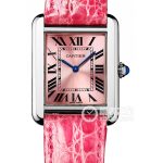 Basic Information ID: W5200000 Brand: Cartier Tank Series Movement Type: Quartz Gender: Ladies Movement Model: Cal.157 Movement Type: Quartz Manufacturer: Cartier Base Movement: ETA-ESA 255.111 Number of Jewels: 4 Case Diameter: 31 x 24.4 mm Case Thickness: 5.55 mm Dial Color: Pink Dial Shape: Square Strap Color: Pink Clasp Type: Folding Clasp Case Back: Solid Weight: Not Available Water Resistance: 30 meters Hour Markers: Roman Numerals Clasp Spacing: Not Available Lug Spacing: Not Available Materials Case Material: Stainless Steel Dial Material: Lacquered Bezel Material: Not Available Crystal Material: Sapphire Crystal Crown Material: Stainless Steel with a Synthetic Spinel Strap Material: Alligator Leather Clasp Material: Stainless Steel Functions: This watch has no other special functions.