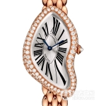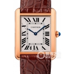 Basic Information: ID: WT100018; Brand: Cartier; Series: Tank; Movement Type: Automatic; Gender: Ladies; Movement Model: Cal.077; Movement Type: Automatic; Manufacturer: Cartier; Base Movement: ETA 2671; Dimensions: Case Diameter: 39.2 x 29.8 mm; Case Thickness: 9.5 mm; Dial Color: Silver-white; Dial Shape: Square; Strap Color: Pinkish-red; Clasp Type: Folding Clasp; Case Back: Solid; Weight: Not available; Water Resistance: 30 meters; Hour Markers: Roman numerals; Clasp Spacing: Not available; Lug Spacing: Not available; Materials: Case Material: 18k white gold, set with 89 brilliant-cut round diamonds; Dial Material: Silver-plated guilloché lacquered dial, sword-shaped blued steel hands; Bezel Material: 18k white gold, diamond-set; Crystal Material: Sapphire crystal glass; Crown Material: Nine-pointed crown, set with one brilliant-cut round diamond, total weight 1.74 carats; Strap Material: Alligator leather; Clasp Material: 18k white gold, 18mm; Functions: Date display.