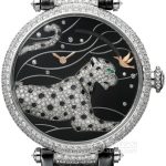 Basic Information: PANTHÈRES ET COLIBRI “Panther and Hummingbird” On-Demand Power Reserve Watch; Cartier Collection Creative Gemstone Watch; Movement Type: Manual Mechanical; Gender: Men’s; Movement Model: 9915 MC; Movement Type: Manual Mechanical; Power Reserve: 72 hours; Case Diameter: 42.75 mm; Case Thickness: 11.4 mm; Dial Color: Patterned; Dial Shape: Round; Strap Color: Black; Clasp Type: Folding Clasp; Case Back: Transparent; Weight: Not Available; Water Resistance: 30 meters; Hour Markers: None; Hour Marker Spacing: Not Available; Lug Spacing: Not Available; Materials: Case Material: White Gold; Dial Material: Not Available; Bezel Material: White Gold with Diamonds; Crystal Material: Sapphire Crystal; Crown Material: White Gold with Diamonds; Strap Material: Alligator Leather; Clasp Material: 18K White Gold; Functions: Power Reserve Display; Long Power Reserve