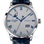 Basic Information Number 1-36-24-02-02-61 Brand Glashütte Original Senator Series Movement Type Automatic Mechanical Gender Men’s Movement Model 36-24 Movement Type: Automatic Mechanical; Manufacturer: Glashütte Original; Balance Wheel: Balance Wheel; Frequency: 28,800 vibrations per hour; Hairspring: Silicon Hairspring; Jewels: 40; Power Reserve: 100 hours; Case Diameter: 40 mm; Case Thickness: 12.2 mm; Dial Color: Gray; Dial Shape: Round; Strap Color: Blue; Clasp Type: Folding Butterfly Clasp; Case Back: Sapphire Crystal; Weight: Not available; Water Resistance: 50 meters; Hour Markers: Roman Numerals; Clasp Spacing: Not available; Lug Spacing: Not available; Materials: Case Material: Stainless Steel; Dial Material: Electroplated Gray Grained Dial with 5N Solid Gold Roman Numeral Hour Markers with Blue Coating; Hour/Minute Hands: Blued Steel; Second Hand: Blue Coating; Bezel Material: Stainless Steel; Crystal Material: Sapphire Crystal; Crown Material: Stainless Steel; Strap Material: Louisiana Alligator Leather; Clasp Material: Stainless Steel; Functions: Large Date, Moon Phase