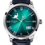 Basic Information Number 1-36-24-06-02-61 Brand Glashütte Original Senator Movement Type Automatic Mechanical Gender Men’s Limited Edition 100 Movement Movement Model 36-24 Movement Type Automatic Mechanical Manufacturer Glashütte Original Balance Wheel Balance Wheel Frequency 28,800 vibrations per hour Hairspring Silicon hairspring Number of Jewels 40 Power Reserve 100 hours Appearance Case Diameter: 40 mm Case Thickness: 12.2 mm Dial Color: Green Dial Shape: Round Strap Color: Dark Blue Clasp Type: Folding Clasp Case Back: Transparent Weight: Not available Water Resistance: 50 meters Hour Markers Type: Roman numerals Clasp Spacing: Not available Lug Spacing: Not available Materials Case Material Stainless Steel Dial Material Not available Bezel Material Stainless Steel Crystal Material Sapphire Crystal Glass Crown Material Stainless Steel Strap Material Alligator Leather (with Blue Nylon Strap) Clasp Material Stainless Steel Functions Large Date Moon Phase
