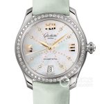 Basic Information ID 1-39-22-12-22-44 (Pin Buckle) Brand Glashütte Original Series Ladies’ Movement Type Automatic Mechanical Gender Ladies’ Movement Movement Model Cal.39-22 Movement Type Automatic Mechanical Manufacturer Glashütte Original Movement Diameter 26mm Movement Thickness 4.3mm Frequency 28,800 vibrations per hour Number of Jewels 25 Power Reserve 40 hours Case Diameter: 36mm Case Thickness: 10.2mm Dial Color: White Dial Shape: Round Strap Color: Light Green Buckle Type: Pin Buckle Case Back: Transparent Weight: Not available Water Resistance: 50 meters Hour Marker Type: Other Hour Markers Buckle Spacing: Not available Lug Spacing: Not available Material Case Material Stainless Steel, Bezel Jewels 52 Brilliant-cut Diamonds (approx. ca. 1.1 ct, TW-VVS) Dial Material White Mother-of-Pearl Dial with Diamond Dots (approx. 0.04 ct, TW) VVS diamonds), rose gold Roman numerals, rose gold hands, bezel material not specified, crystal material sapphire crystal glass, crown material stainless steel with diamonds (ca. 0.1 ct, TW-VVS), strap material satin, buckle material stainless steel, functions: date display.