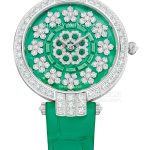 Basic Information ID: PRNAHM36WW049 Brand: Harry Winston Series Excellence Movement Type: Automatic Mechanical Gender: Women’s Limited Edition: 30 Movement Model: HW2008 Movement Type: Automatic Mechanical Manufacturer: Unknown Frequency: 28,800 vibrations per hour Hairspring: Balanced silicon hairspring Jewels: 28 Number of Parts: 186 Power Reserve: 72 hours Appearance: Case Diameter: 36 mm Case Thickness: 8.4 mm Dial Color: White, Green Dial Shape: Round Strap Color: Green Clasp Type: Pin Buckle Case Back: Transparent Weight: Not available Water Resistance: 30 meters Hour Markers: Diamond-set Hour Markers Clasp Spacing: Not available Lug Spacing: Not available Materials: Case Material: 18k white gold set with 54 diamonds Dial Material: Mother-of-pearl set with 120 diamonds and 8 emeralds Bezel Material: 18k white gold set with diamonds Crystal Material: Sapphire crystal Crown Material: 18k white gold set with diamonds Strap Material: Alligator leather Clasp Material: 18k white gold set with 17 diamonds Functions: This watch has no other special functions.