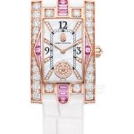 Basic Information: ID: AVEQHM21RR125; Brand: Harry Winston Fifth Avenue; Movement Type: Quartz; Gender: Ladies; Movement Model: HW1046; Manufacturer: Unknown; Case Diameter: 21.4*36.1 mm; Case Thickness: 6.3 mm; Dial Color: Silver-white; Dial Shape: Square; Strap Color: White; Clasp Type: None; Case Back: Solid; Weight: None; Water Resistance: 30 meters; Hour Markers: Diamond-set; Hour Markers: Arabic numerals; Clasp Spacing: None; Lug Spacing: None; Materials: Case Material: 18k Rose Gold; Dial Material: Mother-of-Pearl with 43 Diamonds; Bezel Material: 18k Rose Gold with 62 Diamonds; Crystal Material: Sapphire Crystal; Crown Material: 18k Rose Gold with Diamonds; Strap Material: Alligator Leather; Clasp Material: 18k White Gold with 6 Diamonds; Functions: This watch has no other special functions.