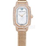 Basic Information: Model Number: EMEQHM18RR005; Brand: Harry Winston Seal; Movement Type: Quartz; Gender: Ladies; Movement Model: HW1040; Manufacturer: Unknown; Case Diameter: 17.7 x 24 mm; Case Thickness: 6.1 mm; Dial Color: White; Dial Shape: Other; Strap Color: Gold; Clasp Type: None; Case Back: Solid; Weight: None; Water Resistance: 30 meters; Hour Markers: Diamond-set; Clasp Spacing: None; Lug Spacing: None; Materials: Case Material: 18k rose gold, set with 53 round brilliant-cut diamonds; Dial Material: Mother-of-pearl; Bezel Material: None; Crystal Material: Sapphire Crystal; Crown Material: 18k rose gold; Strap Material: 18k rose gold; Clasp Material: 18k rose gold, set with 47 round brilliant-cut diamonds; Functions: This watch has no other special functions.