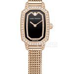 Basic Information: ID: EMEQHM18RR022; Brand: Harry Winston Seal; Movement Type: Quartz; Gender: Ladies; Movement Model: HW1040; Manufacturer: Unknown; Case Diameter: 17.7*24 mm; Case Thickness: 6.1 mm; Dial Color: Black; Dial Shape: Other; Strap Color: Gold; Clasp Type: None; Case Back: Solid; Weight: None; Water Resistance: 30 meters; Hour Marker Type: None; Hour Marker Spacing: None; Lug Spacing: None; Materials: Case Material: 18k Rose Gold with Diamonds; Dial Material: None; Bezel Material: Diamonds; Crystal Material: Sapphire Crystal; Crown Material: 18k Rose Gold with Diamonds; Strap Material: 18k Rose Gold; Clasp Material: 18k Rose Gold; Functions: This watch has no other special functions.