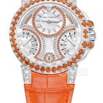 Basic Information ID: OCEABI36WW064 Brand: Harry Winston Ocean Series Movement Type: Automatic Mechanical Gender: Women’s Limited Edition: 20 Movement Model: HW3302 Movement Type: Automatic Mechanical Manufacturer: Unknown Frequency: 28,800 vibrations per hour Hairspring: Flat silicon hairspring Jewels: 35 Power Reserve: 65 hours Appearance: Case Diameter: 36 mm Case Thickness: 9.3 mm Dial Color: White Dial Shape: Round Strap Color: Orange Clasp Type: Not Available Case Back: Not Available Weight: Not Available Water Resistance: 100 meters Hour Marker Type: Bat Hour Markers Clasp Spacing: Not Available Lug Spacing: Not Available Materials: Case Material: 18k white gold, diamond-set lugs Dial Material: Mother-of-pearl Bezel Material: 18k white gold, set with 41 round brilliant-cut orange aluminum garnets Crystal Material: Sapphire crystal Crown Material: 18k white gold Strap Material: Pearl-finish alligator leather Clasp Material: 18k white gold Functions: Date Display, Day Display, Flyback/Retrograde