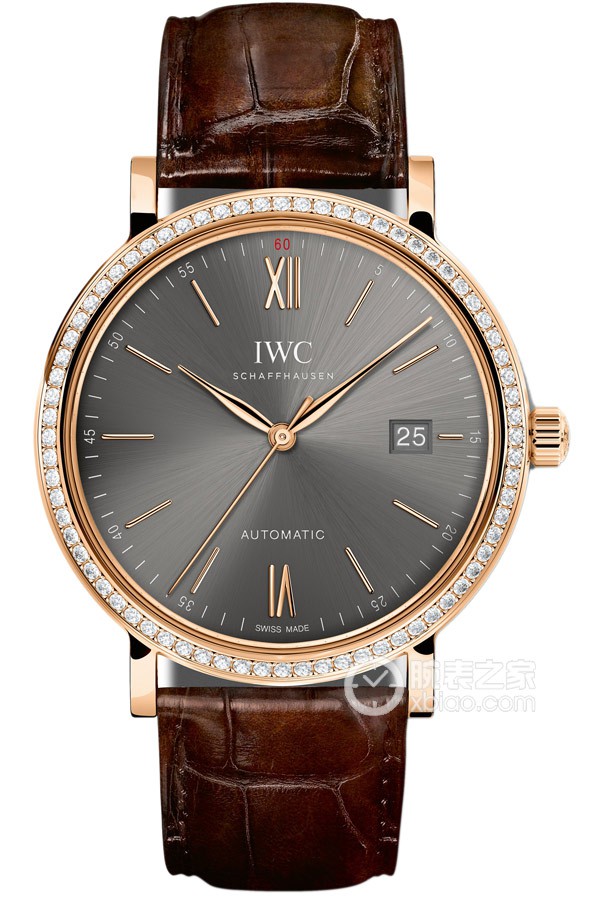 Basic Information: ID: IW356516; Brand: IWC; Series: Portofino; Movement Type: Automatic; Gender: Men’s; Movement Model: 35111; Manufacturer: IWC; Jewels: 25; Parts: 163; Power Reserve: 50 hours; Appearance: Case Diameter: 40mm; Case Thickness: 9.5mm; Dial Color: Dark Grey; Dial Shape: Round; Strap Color: Dark Brown; Clasp Type: Pin Buckle; Case Back: Not Available; Weight: Not Available; Water Resistance: 30 meters; Hour Marker Type: Bat; Clasp Spacing: Not Available; Lug Spacing: Not Available; Materials: Case Material: 18k Rose Gold; Dial Material: Diamond-set; Bezel Material: 18k Rose Gold with 72 diamonds; Crystal Material: Sapphire Crystal Glass, Double Anti-reflective Convex Sapphire Crystal; Crown Material: 18k Rose Gold; Strap Material: Alligator Leather; Clasp Material: 18k Rose Gold; Functions: Date Display