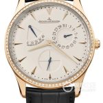 Basic Information ID: 1372501 Brand: Jaeger-LeCoultre Ultra Thin Master Movement Type: Automatic Mechanical Gender: Men’s Movement Model: 938 Movement Type: Automatic Mechanical Manufacturer: Jaeger-LeCoultre Movement Thickness: 4.97 mm Frequency: 28,800 vibrations per hour Jewels: 39 Number of Parts: 262 Power Reserve: 70 hours Exterior Case Diameter: 39 mm Case Thickness: 9.85 mm Dial Color: Beige Dial Shape: Round Strap Color: Dark Brown Buckle Type: Pin Buckle: 18.0 mm Case Back: Transparent Weight: Not available Water Resistance: 50 meters Hour Marker Type: Tapered Hour Markers Buckle Spacing: 18 mm Lug Spacing: 21 mm Materials Case Material: 18k Rose Gold Dial Material: Not available Bezel Material: 18k Rose Gold, set with 80 diamonds weighing 0.57 carats Crystal Material: Sapphire Crystal Crown Material: 18k Rose Gold Strap Material: Leather Buckle Material: 18k Rose Gold Functions: Date Display Power Reserve Display