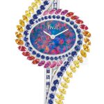 18k white gold, with two bands of gemstones set on the bezel and lugs. The outer band features 58 marquise-cut sapphires (approx. 6.23 carats) ranging from yellow to orange and 14 brilliant-cut rubies (approx. 1.41 carats). The inner band features 86 brilliant-cut sapphires (approx. 5.51 carats). Case material