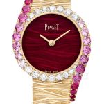 The watch case is made of 18k rose gold and set with 20 diamonds (approximately 1.46 carats), 10 rubies (approximately 1.10 carats), and 12 sapphires (approximately 2.91 carats).