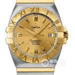 Basic Information ID 1213.10.00 Brand: Omega Movement Type: Quartz Gender: Men’s Movement Type: Quartz Case Diameter: 38mm Case Thickness: Not Available Dial Color: Gold Dial Shape: Round Strap Color: Two-tone Clasp Type: Folding Clasp Case Back: Not Available Weight: Not Available Water Resistance: 100 meters Hour Marker Type: Bat Hour Markers, Roman Numerals Clasp Spacing: Not Available Lug Spacing: Not Available Materials: Case Material: Stainless Steel Dial Material: Not Available Bezel Material: 18k Gold Crystal Material: Sapphire Crystal Crown Material: 18k Gold Strap Material: Stainless Steel/18k Gold; Two-tone Clasp Material: Stainless Steel Functions: Date Display