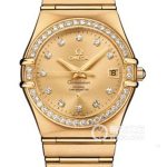 Basic Information ID: 111.55.36.20.58.001 Brand: Omega Constellation Movement Type: Automatic Gender: Men’s Movement Type: Automatic Technical Certification: Swiss Official Chronometer Testing Institute (COSC) Appearance: Case Diameter: 36mm Case Thickness: 8mm Dial Color: Gold Dial Shape: Round Strap Color: Gold Clasp Type: Folding Clasp Case Back: Not Available Weight: Not Available Water Resistance: 50 meters Hour Markers: Diamond-set Hour Markers Clasp Spacing: Not Available Lug Spacing: Not Available Materials: Case Material: 18k Gold Dial Material: Set with 11 exquisite diamonds Bezel Material: 18k Gold with diamonds Crystal Material: Sapphire Crystal Crown Material: 18k Gold Strap Material: 18k Gold Clasp Material: 18k Gold Functions: Date Display