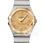 Basic Information ID: 123.10.27.20.58.001 Brand: Omega Series: Constellation Movement Type: Automatic Mechanical Gender: Ladies’ Movement: Movement Model: 8520 Movement Type: Automatic Mechanical Manufacturer: Omega Movement Diameter: 20mm Movement Thickness: 5.3mm Balance Wheel: Free-sprung Balance Spring Frequency: 25,200 vibrations per hour Hair Spring: Si 14 silicon Hair Spring Jewels: 28 Power Reserve: 50 hours Technical Certifications: Swiss Official Chronometer Testing Institute (COSC) Appearance: Case Diameter: 27mm Case Thickness: Not available Dial Color: Gold Dial Shape: Round Strap Color: Two-tone Clasp Type: Folding Clasp Case Back: Transparent Weight: Not available Water Resistance: 100 meters Hour Markers: Diamond-set Hour Markers Clasp Spacing: Not available Lug Spacing: Not available Materials: Case Material: Stainless Steel Dial Material: Not available Bezel Material: 18k Gold Crystal Material: Sapphire Crystal Crown Material: Not available Strap Material: Stainless Steel/18k Gold; Two-tone Clasp Material: Stainless Steel Functions: This watch has no other special functions.